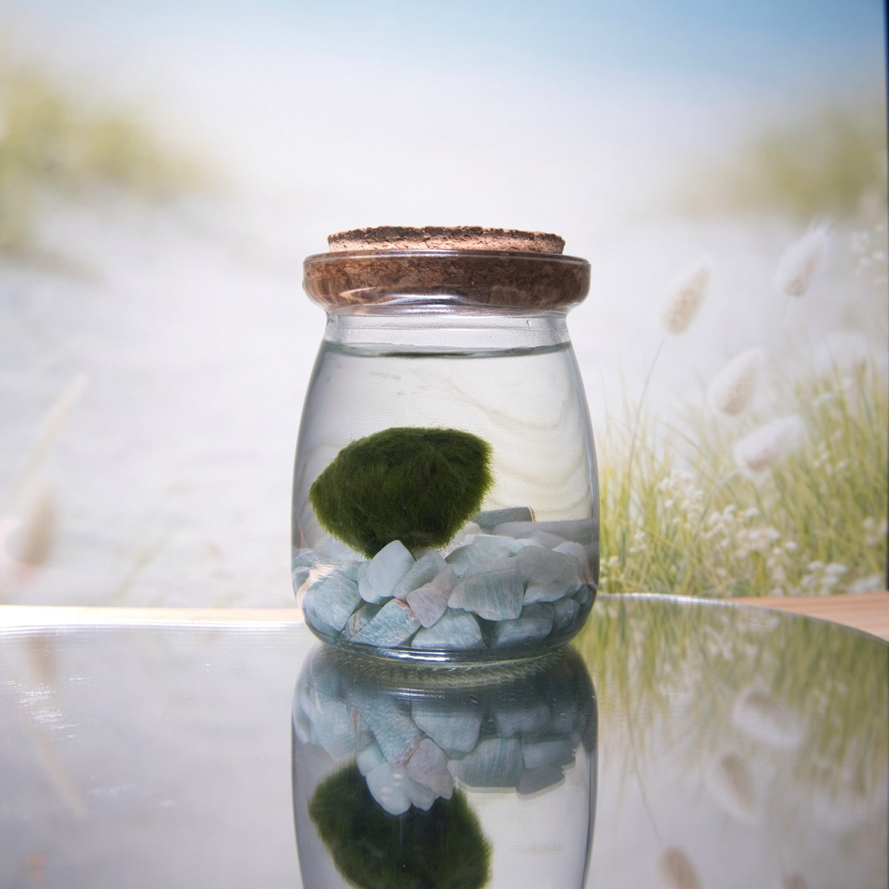 A Moonling is a real marimo, a velvety freshwater algae puff with a gentle spirit, in a keepsake jar with intention crystals. Think tiny calm companion, part house-plant, part pocket-lake, all vibes.