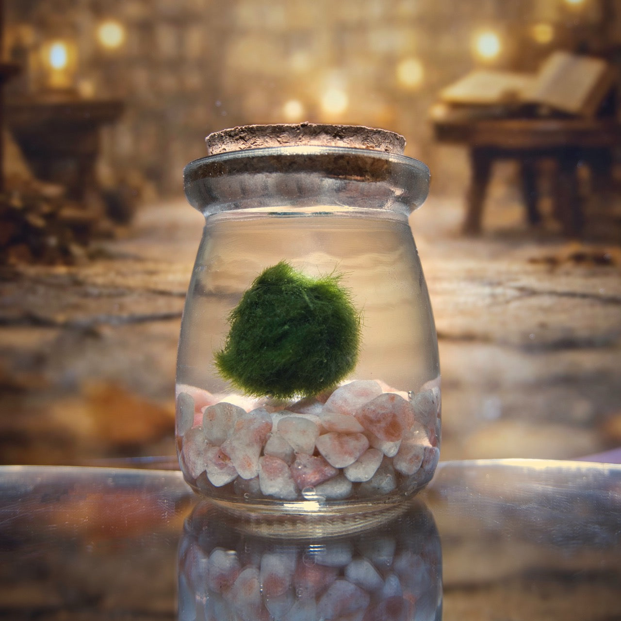 A Moonling is a real marimo, a velvety freshwater algae puff with a gentle spirit, in a keepsake jar with intention crystals. Think tiny calm companion, part house-plant, part pocket-lake, all vibes.